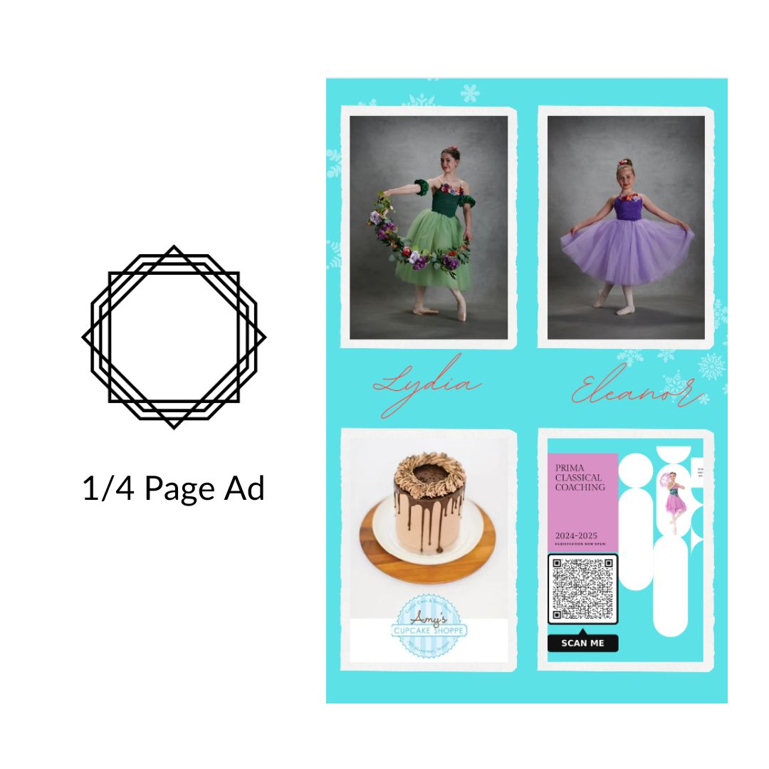 Promote your business or celebrate your dancer with a 1/4 page ad in our production program!